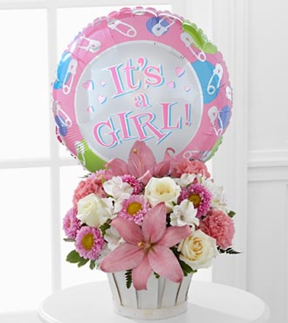 Girls Are Great! is blooming with sweet love to congratulate the new family on thier darling baby girl! White roses, white Peruvian lilies, pink carnations, pink matsumoto asters, pink Asiatic lilies and lush greens are beautifully arranged in a round whitewash woodchip basket. Presented with a mylar balloon declaring, "It's a Girl!", this incredible flower arrangement is the perfect welcome for their new addition.